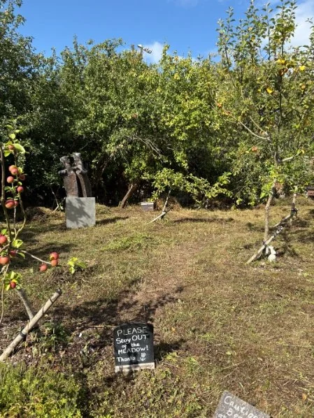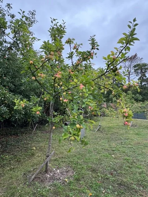 Now our attention turns to the orchard trees. They are a wonky bunch, owing to their difficult start. We purchased them when we had some funds, probably around 2014, but had to heel them in for 2 years, using the then-empty raised beds. The area that was to be the meadow and orchard was still a building site and the garden team we have now did not yet exist.